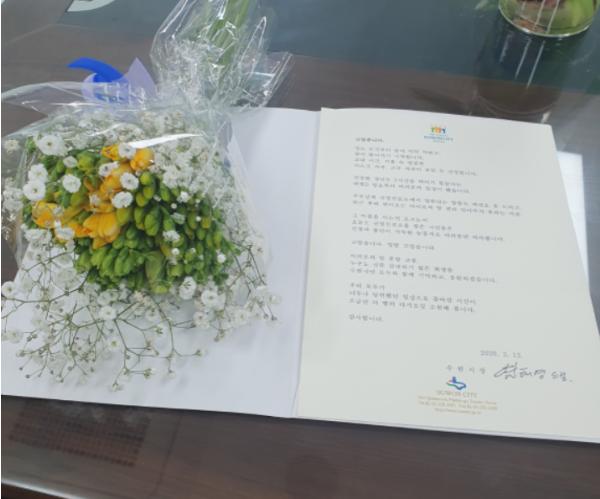 화이트데이를 앞둔 지난 13일 자로 전달된 편지에는 “감사합니다. 누구도 선뜻 감내하기 힘든 희생을 수원시민 모두와 함께 기억하고 응원하겠습니다”라는 내용이 담겼다.