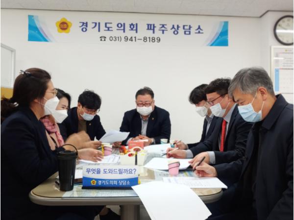 [세계연합신문, 곽동근기자] 경기도의회 파주상담소에서 지난 13일 파주지역 도의원 5명(조성환, 손희정,김경일, 이진, 오지혜)이 파주시청 공무원과 함께 파주시 주요현안 및 조정교부금 확보 방안을 위한 간담회를 가졌다.