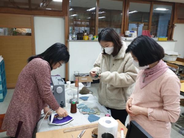 천연염색 마크스 제작은 일일이 손으로 원단을 재단하고 재봉틀로 박음질해야 하는 등 시간이 상당히 소요돼 1시간에 3개 이상 만들기가 어렵지만 당일 근무하는 교사들과 수석교사, 교장선생님이 함께 정성을 담아 천연염색 마스크를 자체 제작했다.