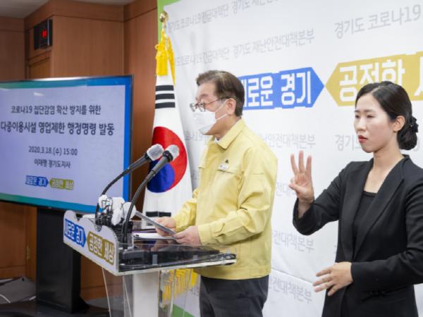 이재명 경기도지사는 18일 경기도청에서 코로나19 관련 긴급 기자회견을 열고 집단감염을 막기 위해, PC방.노래방.클럽형태업소에 대한 밀접이용제한 행정명령을 담은 보건방역, 재난기본소득을 주요내용으로 하는 경제방역, 과도한 불안감과 공포를 극복할 수 있는 심리방역 등 3대 방역정책을 추진하겠다고 밝혔다.