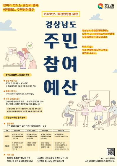 한편, 경상남도는 지난 16일에 주민참여예산 홈페이지를 본격 오픈하였으며 주민참여예산 홈페이지 사용법 동영상을 시청하고 퀴즈를 맞추는 오픈 이벤트를 4월 30일까지 진행한다.