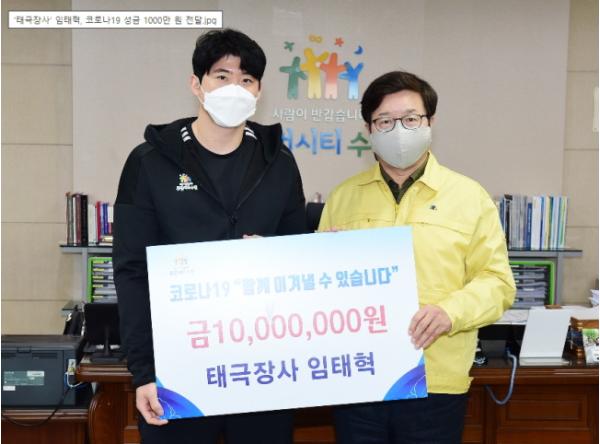 [세계연합신문, 곽동근기자] 수원시청 씨름단 소속 임태혁 선수(31)가 24일 오전 11시 염태영 수원시장 집무실에서 “코로나19로 어려움을 겪는 시민들을 위해 써 달라”며 성금 1000만 원을 기탁했다.
