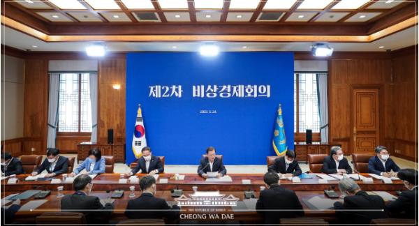 [세계연합신문, 박행주기자] 코로나19에 따른 비상경제 상황을 대응하기 위한 제2차 비상경제회의가 문재인 대통령 주재로 열렸다. 이 자리에서 대통령은 "1차 회의에서 결정한 50조원 규모의 ‘비상 금융 조치’를 대폭 확대해 100조원 규모의 기업구호 긴급자금을 투입하기로 결정했다"고 밝혔다.