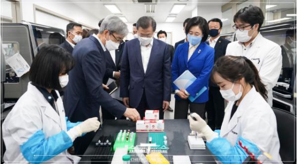 [세계연합신문, 박행주기자] 문재인 대통령은 오늘 코로나19 진단시약 긴급사용 승인을 받은 기업을 방문해 신속한 대처와 정확한 검사를 통해 코로나19 극복에 기여하고 있는 기업과 연구진의 노고를 격려했다.