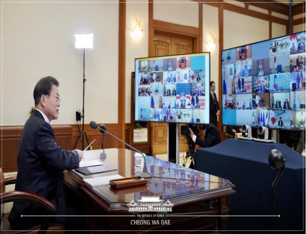 이어 대통령은 국제사회의 연대 강화와 정책 공조를 통해 코로나19를 극복해 나가자며 방역 경험과 임상 데이터를 공유하고 치료제와 백신 개발, 경제 안정을 위한 협력을 제안했다. 또한 과학자, 의사, 기업인 등 필수 인력의 이동을 허용하는 방안을 함께 모색해 나갈 것을 국제사회에 제의했다.