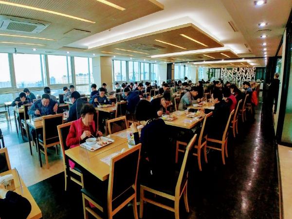 본청 구내식당은 오전 11시 30분부터 오후 1시 30분까지 운영한다. 직원들은 시차를 두고 3조로 나눠 식사한다. 마스크를 착용하고, 입구에서 손을 소독한 후 구내식당에 들어가야 한다.