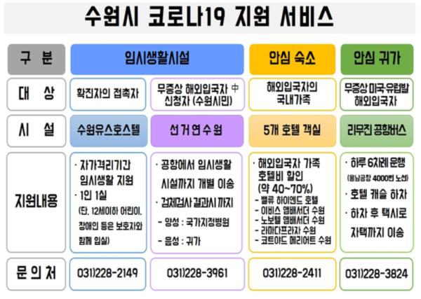 지난 28일에는 ‘유럽·미국발 입국자 안심귀가 전용 리무진버스·택시 서비스’를 시작했다. 인천국제공항 특별입국절차에서 ‘무증상’ 입국자로 분류된 수원시민이 이용할 수 있다.
