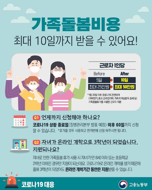 [세계연합신문, 김종근기자] 가족돌봄비용, 근로자 1인당 최대 10일까지 받을 수 있습니다.