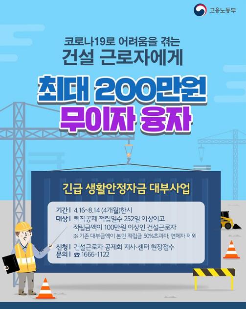 [세계연합신문, 김종근기자] 코로나19로 어려움을 겪는 건설 근로자에게 긴급 생활안정자금을 최대 200만원까지 무이자로 빌려줍니다.