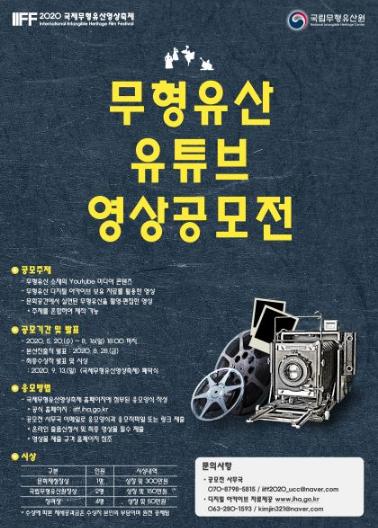 [세계연합신문, 김성욱기자] 문화재청 국립무형유산원(원장 김연수)은 정부혁신의 역점과제로 추진 중인 ’2020 국제무형유산영상축제‘(9.11.~13.)의 하나로 ‘무형유산 유튜브 영상공모전’을 개최한다.