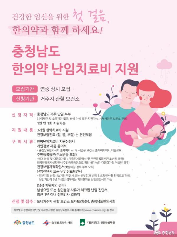 [세계연합신문, 박웅기기자] 충남도가 올해 난임 부부 한방치료 지원 대상 기준을 대폭 확대하고, 지원 조건을 완화한다.