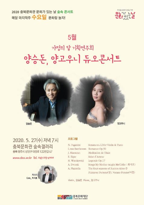 그동안‘크로나19’로 문화가 있는 날 행사가 취소된 후 진행되는 첫 공연으로, 부녀지간인 충북도립교향악단의 상임지휘자인 양승돈과 피아니스트인 양고우니의 듀오 콘서트로 작곡가 신만식이 기획, 연출한다.