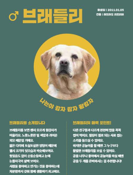 견종은 래브라도 리트리버와 스프링거 스파니엘로, 모두 우수한 혈통의 순종견들이다. 기초 훈련을 잘 받았고, 영리하며 친화력이 뛰어나 훈련 교관과 핸들러들의 사랑을 듬뿍 받아왔다.