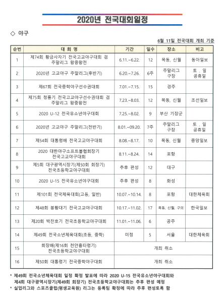 2020년도 전국야구?소프트볼대회 일정은 교육부의 전국 초등?중학?고교의 등교 개학일에 대한 최종 연기 결정(2020.05.20., 고3부터 순차 등교)과 대한체육회로부터 전달받은 ‘학생선수가 참가하는 전국대회 개최와 관련한 정부의 의견’을 반영한 결과다.