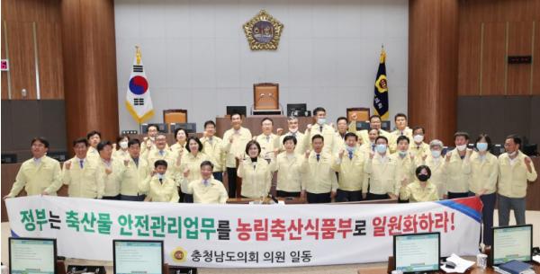 충남도의회(의장 유병국)는 25일 제320회 임시회 2차 본회의에서 ‘축산물 안전관리 업무의 농림축산식품부 일원화 촉구’ 건의안을 채택했다.