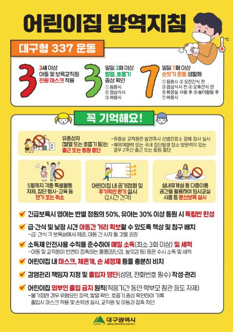 또한, 긴급보육 수요 증가에 따라 부모들이 믿고 맡길 수 있는 안심보육 환경조성을 위해 기존 보건복지부 지침을 강화한 대구형 3?3?7 생활수칙(3세이상 전원 마스크, 3회 이상 발열?호흡기증상 확인, 일일 7회이상 손씻기) 및 유증상자 발견 시 대처 로드맵을 제작해 관내 어린이집에 배포했다.