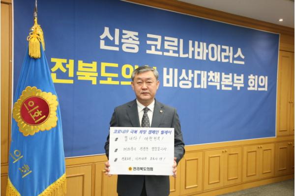 ‘전문건설협회 전북도회 김태경 회장’ 추천으로 이번 캠페인에 동참한 송 의장은 ‘#힘내라! 대한민국! #여러분이 진정한 영웅입니다. #전북도민, 이겨내자 코로나19!’라는 손 글씨 응원 문구를 촬영, 페이스북에 게재해 국민과 의료진에 희망의 메시지를 전달했다.