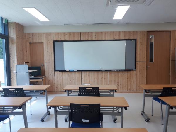 2층 제1강의실은 피톤치드를 많이 방출하고 항균작용 효과가 있는 편백나무로 벽면과 바닥까지 마감해 강의실에 들어서는 순간 향긋한 편백나무 향을 느낄 수 있다.