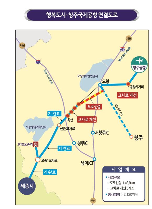 행복도시~청주국제공항 연결도로는 총연장 L=14.3km로 4차로 신설 3.9km와 평면교차로 5개소를 입체화하는 사업으로 총사업비 2,120 억 원이 소요되는 사업이다.