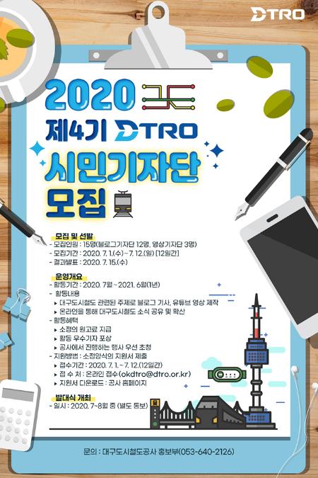 대구도시철도공사(사장 홍승활)는 페이스북, 블로그, 유튜브 등 공사 SNS를 통해 도시철도와 관련한 다양한 소식을 전할「제4기 디트로 시민기자단」을 오는 7월 12일(일)까지 모집한다.