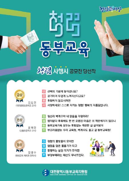 이번 포스터는 청렴사행시 공모전 수상작 금상, 은상, 동상 선정작 및 부정부패 근절을 독려하는 내용이며 각급 학교 및 부서 사무실에 게시할 예정이다.